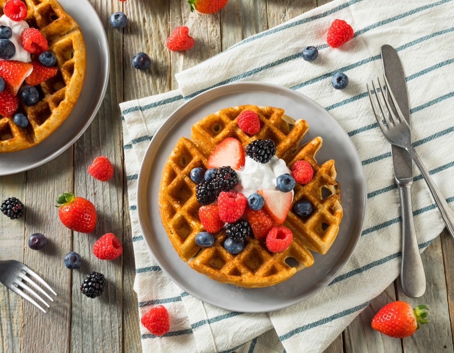 Belgian waffles made in a waffle iron are wonderful delicacies served with all kinds of syrups, chocolate sauce, honey, condensed milk, and berries. The waffles in this recipe appear to be large and thick, crispy on the outside and soft on the inside.